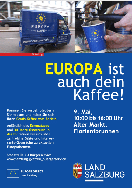 EUROPE DIRECT Land Salzburg lädt anlässlich "30 Jahre Österreich bei der EU" und des Europatages 2025 alle interessierten Bürgerinnen und Bürger zu einem köstlichen, kostenlosen Barista-Kaffee am Alten Markt in der Stadt Salzburg ein. Mit dabei sind Europa-Gemeinderätinnen und Europa-Gemeinderäte sowie natürlich das Team von EUROPE DIRECT Salzburg. Wir freuen uns über zahlreichen Besuch!