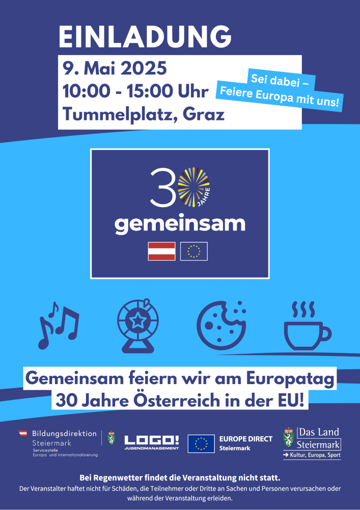 Am 9. Mai ist es so weit! Gemeinsam mit unseren steirischen Partnerorganisationen aus dem Netzwerk "Jugend – Europa – Bildung – Kultur" (JEBK-Netzwerk) feiern wir nicht nur den Europatag 2025, sondern auch ein ganz besonderes Jubiläum: 30 Jahre Österreich in der Europäischen Union! Begangen werden 3 Jahrzehnte europäischer Zusammenarbeit, Austausch und Mitgestaltung mit inspirierenden Begegnungen, spannenden Gesprächen und einem bunten Programm rund um Europa, Zusammenhalt und die Zukunft unseres Kontinents.