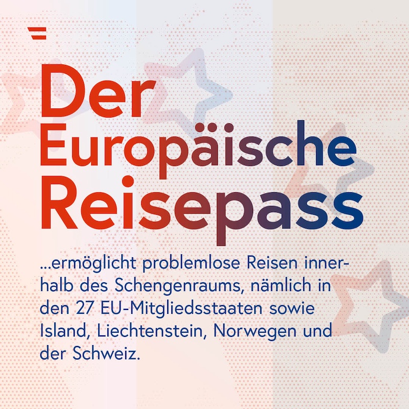 Reisen durch Europa – ohne Hindernisse. Der Europäische Reisepass ermöglicht das problemlose Reisen innerhalb des Schengenraums, in den 26 EU-Mitgliedstaaten sowie Island, Liechtenstein, Norwegen und der Schweiz. Der Europäische Reisepass wird von jedem Mitgliedstaat der EU an die Unionsbürgerinnen und -bürger ausgestellt. Dies bedeutet, dass Reisende ohne zeitraubende Passkontrollen zwischen den teilnehmenden Ländern reisen können. Dies erleichtert nicht nur den Tourismus, sondern auch geschäftliche Aktivitäten und den kulturellen Austausch innerhalb Europas. Des Weiteren bietet der Europäische Reisepass den EU-Bürgerinnen und -Bürgern Schutz im Ausland durch konsularische Unterstützung der jeweiligen EU-Botschaften und -Konsulate. Bei Notfällen, Passverlust oder unvorhergesehenen Ereignissen stehen den Reisenden damit umfassende Hilfe und Beratung zur Verfügung.