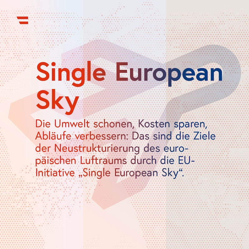 Die Umwelt schonen, Kosten sparen, Abläufe verbessern. Das sind die Zielsetzungen der Neustrukturierung des europäischen Luftraums durch die 2004 ins Leben gerufene Initiative "Single European Sky" (SES, oder "Einheitlicher europäischer Luftraum"). Nach und nach soll der "Fleckerlteppich" nationaler Flugsicherungssysteme einem einheitlichen System weichen. Mit einem effizienteren sowie klimafreundlicheren gemeinsamen Luftraummanagement in Europa soll auch die Pünktlichkeit und Sicherheit der Flugsicherungssysteme verbessert werden. Zu diesem Zweck hat die Europäische Kommission die Europäische Organisation zur Sicherung der Luftfahrt (Eurocontrol) zum europäischen Netzwerkmanager ernannt. Davon profitieren auch die Bürgerinnen und Bürger: Eurocontrol setzt kurzfristige Maßnahmen, um Staus und Verzögerungen im Flugverkehr insbesondere in Hauptreisezeiten entgegen zu wirken.