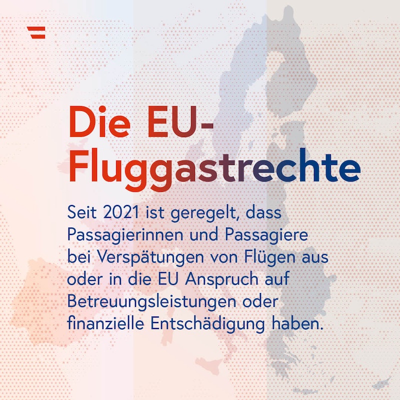 Flug verspätet. Wer zahlt den Schaden? Das regeln seit dem 1. Jänner 2021 die EU-Vorschriften über Fluggastrechte, sofern sich der Startflughafen innerhalb der EU befindet oder der Flug aus einem Nicht-EU-Land in die EU geht und von einer Fluggesellschaft aus der EU durchgeführt wird.
