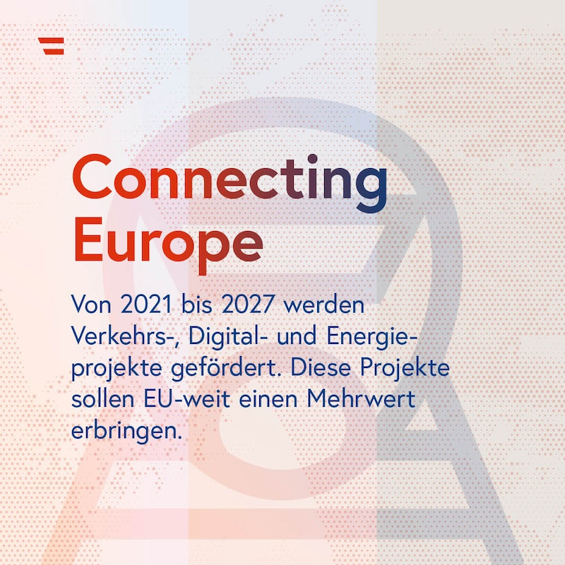 Verkehr, Daten, Energie – starke Netze durch Europa: Gemeinsam stärker vernetzt. Mit ihrem Programm "Connecting Europe" (CEF) will die EU die Infrastruktur und die digitale Vernetzung innerhalb der Union verbessern – und das länderübergreifend. Investitionen in den Ausbau von Verkehrsnetzen wie Schienen, Wasserwege und Straßen sollen unter anderem die Mobilität innerhalb der EU erleichtern. Arbeiten und Studieren, aber auch Urlaubsaufenthalte außerhalb des Heimatortes sollen damit attraktiver und bequemer werden. Die wichtigsten europäischen Projekte im Rahmen von "Connecting Europe", wie etwa das Bahnprojekt "Rail Baltica" – eine knapp 900 km lange Bahnverbindung durch die baltischen Staaten nach Polen – der Ausbau der Infrastruktur für alternative Kraftstoffe wie Wasserstoff und die 5G-Netzabdeckung, sollen plangemäß bis zum Jahr 2030 fertiggestellt werden. In Österreich profitiert die Koralmbahn von Mitteln aus "Connecting Europe". 60 Prozent der Fördermittel von "Connecting Europe" müssen in Projekte fließen, die im Einklang mit den EU-Klimazielen stehen.