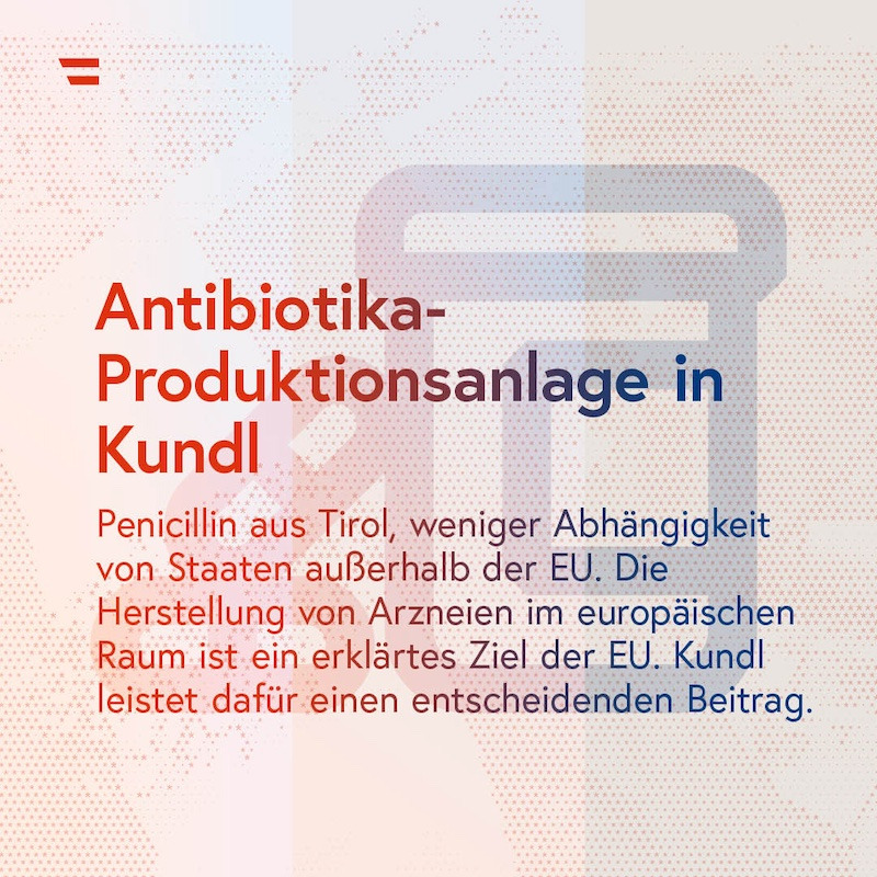 Penizillin aus Tirol, weniger Abhängigkeit aus Fernost. Das Pharmaunternehmen Sandoz hat seinen Standort in der Tiroler Marktgemeinde Kundl zukunftsfit gemacht und die letzte Penizillin-Produktion in Europa modernisiert und erweitert. Das Werk in Kundl erledigt dabei alles: von der Gewinnung des Wirkstoffs bis hin zur Produktion des fertigen Produkts als Antibiotikum. 45 Millionen Euro stellten die österreichische Bundesregierung und 5 Millionen Euro das Land Tirol zur Verfügung, weitere 100 Millionen Euro hat das Unternehmen Sandoz selbst in seine erneuerte Produktionsstätte investiert. Die Europäische Kommission stimmte der Beihilfe im Juli 2023 zu.