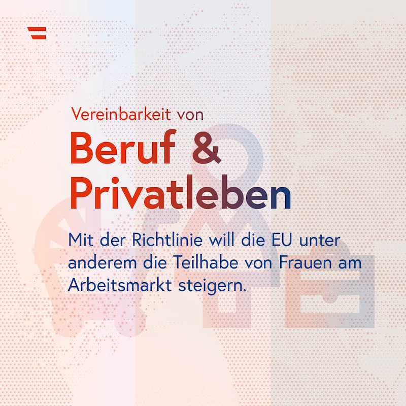 Immer noch gehen EU-weit rund 9,1 Prozent weniger Frauen einer bezahlten Arbeit nach als Männer; In Österreich waren es im 3. Quartal 2024 6,4 Prozent. Mit der Richtlinie zur Vereinbarkeit von Beruf und Privatleben will die EU die Teilhabe von Frauen am Arbeitsmarkt sowie die Inanspruchnahme von Urlaub aus familiären Gründen steigern; damit setzt sie Mindeststandards für die gesamte Union. Sie garantiert berufstätigen Vätern mindestens 10 Tage Vaterschaftsurlaub und jedem Elternteil 4 Monate Elternurlaub, davon 2 bezahlt. Zusätzlich erhalten alle Arbeitnehmerinnen und Arbeitnehmer jährlich 5 Tage Pflegeurlaub. Alle berufstätigen Eltern mit Kindern bis 8 Jahren und alle pflegenden Angehörige haben das Recht, verkürzte und flexible Arbeitszeiten sowie eine höhere Flexibilität am Arbeitsplatz zu beantragen. In Österreich sind die Ansprüche höher. Mit den Mindeststandards schafft die EU einen gewissen Ausgleich zwischen den Mitgliedstaaten und leistet damit einen wichtigen Beitrag für mehr Chancengleichheit.