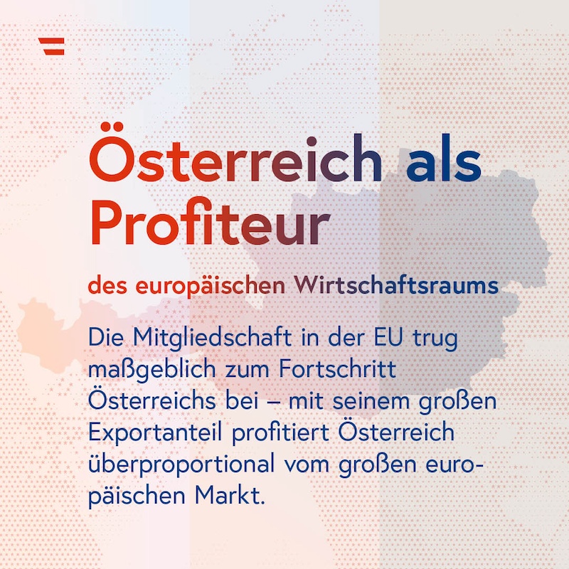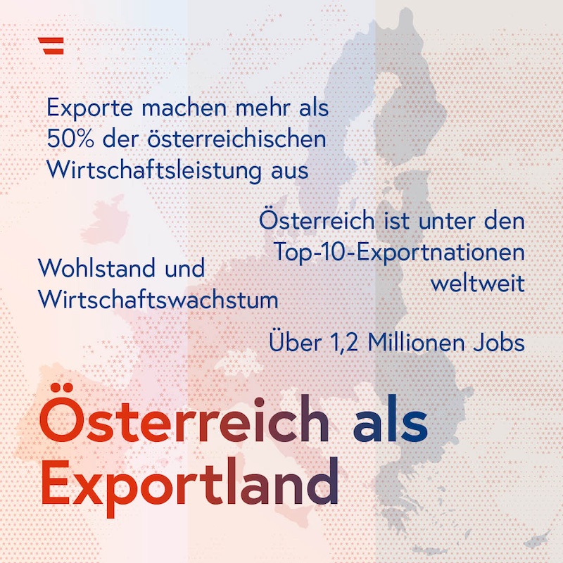 Die EU-Mitgliedschaft hat Österreich den Weg zur Spitzenposition im Bereich Exportwirtschaft geebnet. Seit 1995, dem Jahr des österreichischen EU-Beitritts, haben sich die Exporte in den europäischen Binnenmarkt mehr als verdreifacht. Knapp 71 Prozent der Exporte von Waren und Dienstleistungen aus Österreich gehen aktuell in andere EU-Mitgliedstaaten. Etwa 10 Prozent aller österreichischen Unternehmen sind im Auslandsgeschäft tätig. Dies sichert nicht nur Wohlstand und Wirtschaftswachstum, sondern auch zahlreiche Arbeitsplätze: Mehr als 1,2 Millionen Jobs hängen direkt oder indirekt von der Exportwirtschaft ab.
