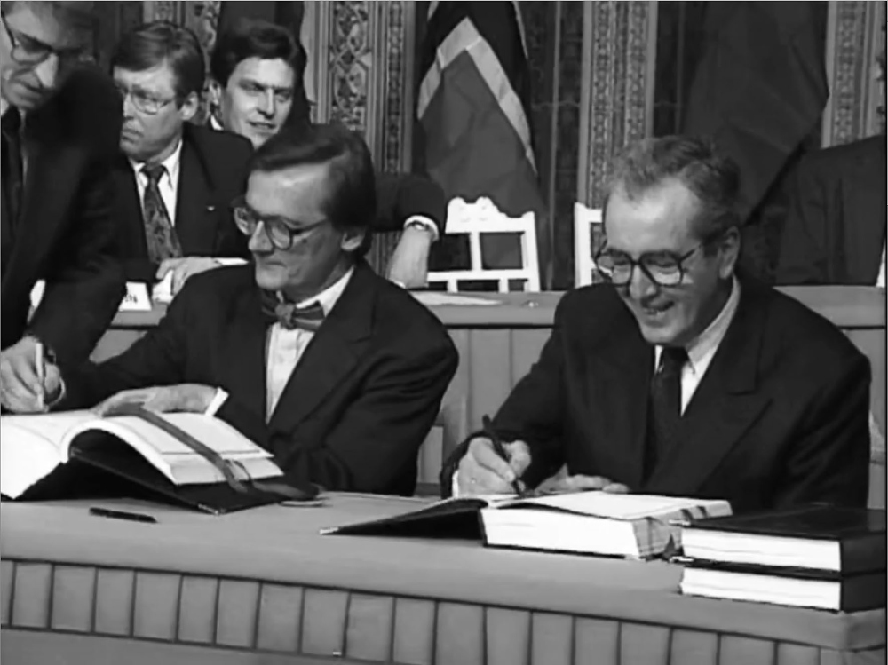 Der Jurist Wolfgang Schüssel (ÖVP) war ab 1989 als Bundesminister für Wirtschaftliche Angelegenheiten federführend an den Verhandlungen beteiligt, die am 1. Jänner 1995 zu Österreichs EU-Beitritt führten. Am 17. Juli 1989 überreichte Österreich seinen Antrag auf Mitgliedschaft in den Europäischen Gemeinschaften (EWG, EGKS, EURATOM). Am 2. Mai 1992 unterzeichneten der damalige Außenminister Alois Mock und Wirtschaftsminister Wolfgang Schüssel in Porto, Portugal, den EWR-Vertrag, der eine Teilhabe an den "4 Freiheiten" (Dienstleistungen, Güter, Kapital und Personen) vorsah; die Mitglieder waren aber noch nicht in den EU-Institutionen vertreten. Der Europäische Wirtschaftsraum trat mit 1. Jänner 1994 in Kraft und fungierte für Österreich als "Sprungbrett" zur später folgenden EU-Mitgliedschaft. "'Gemeinsam statt einsam' ist nach wie vor aktuell und trifft genau das, worum es geht", so Schüssel im Jahr 2019 zum Slogan der Informationskampagne im Vorfeld der Volksabstimmung über Österreichs EU-Beitritt am 12. Juni 1994. Von 1995 bis 2000 fungierte Schüssel als Bundesminister für auswärtige Angelegenheiten, von 2000 bis 2007 als österreichischer Bundeskanzler.