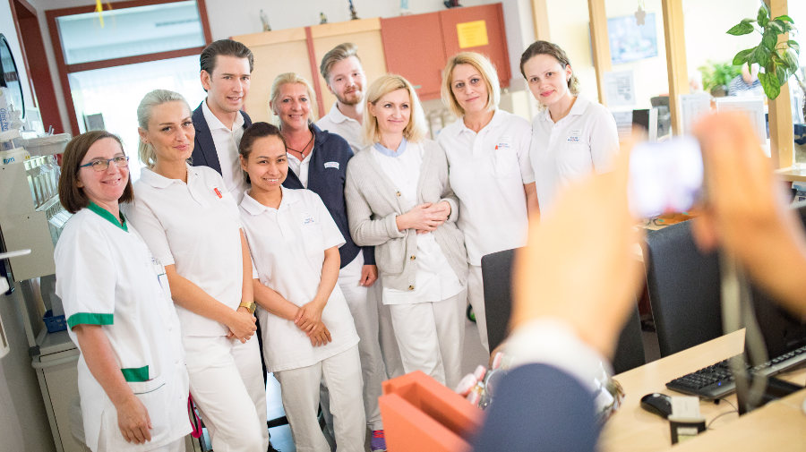 " Der Bundeskanzler besuchte am 1. Mai das Pflegekrankenhaus "Haus der Barmherzigkeit" im 16. Wiener Gemeindebezirk. Er nutzte einen Rundgang zu Gesprächen mit Bewohnerinnen und Bewohnern sowie mit dem Direktor und dem Pflegepersonal.