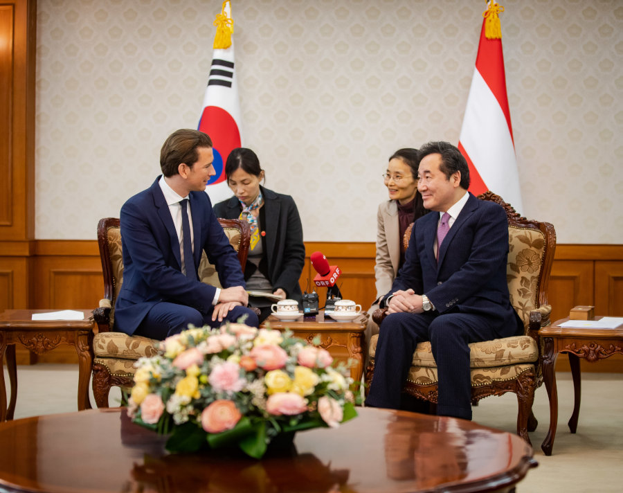 In weiterer Folge traf Bundeskanzler Sebastian Kurz mit dem Premierminister von Südkorea, Lee Nak-yeon, zusammen: "Ich möchte meinem südkoreanischen Amtskollegen volle Unterstützung bei seiner Politik zur Lösung des Konflikts mit Nordkorea zusagen. Vor allem mit der UNO kann das Ziel einer atomwaffenfreien koreanischen Halbinsel erreicht werden." Premierminister Lee betonte nach dem Gespräch in Seoul, dass man sich bemühen werde, das Zeitalter des Kalten Krieges zu beenden und ein Zeitalter des Friedensprozesses herbeizuführen. Beide Regierungschefs wollen die Zusammenarbeit und den bilateralen Austausch auf wirtschaftlicher Ebene sowie in Wissenschaft und Forschung weiter ausbauen. Der Bundeskanzler sieht vor allem bei der Kooperation in den Bereichen Digitalisierung und Künstliche Intelligenz sowie im wechselseitigen Tourismus großes Potenzial. In Südkorea standen auch noch Treffen mit Staatspräsident Moon Jae-in und dem Vize-Vorsitzenden von Samsung Electronics, Boo-Keun Yoon, auf dem Programm. Bereits vor der Reise zeigte sich der Bundeskanzler erfreut darüber, dass "das bilaterale Handelsvolumen im vergangenen Jahr ein historisches Hoch erreicht hat". Südkorea ist damit nach China und Japan drittgrößter österreichischer Exportmarkt in Asien. Die österreichischen Direktinvestitionen liegen derzeit bei rund 1,1 Milliarden Euro.