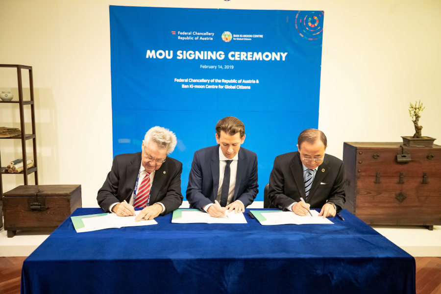 "Gleichzeitig geht es aber auch darum, auf die Ressourcen der Erde und die Umwelt zu achten. Rückschläge bei der Erreichung der nachhaltigen Entwicklungsziele würden alle Staaten treffen", betonte Bundeskanzler Kurz mit Verweis auf die notwendigen Beiträge zum Klimaschutz und die zu vermeidende Abkehr von der Abrüstung. Abschließend warnte er vor zu viel Bürokratie und Überregulierung in der EU: "Dadurch wird die Freiheit der Bürgerinnen und Bürger eingeschränkt, Innovationskraft gehemmt und der Wettbewerbsfähigkeit geschadet." Österreich wolle er von Rang 9 im SDG-Index der UNO bis 2020 unter die Top 5 bringen. Das Forum an der Yonsei-Universität bot auch die Gelegenheit zu einem Treffen mit dem ehemaligen UNO-Generalsekretär Ban Ki-moon. Beide unterzeichneten dabei eine Vereinbarung über die Zusammenarbeit des Bundeskanzleramts mit dem "Ban Ki-moon Centre for Global Citizens" zur Umsetzung der "Sustainable Development Goals". Ban Ki-moon lobte Bundeskanzler Sebastian Kurz im Rahmen seiner einleitenden Rede und bezeichnete ihn als jungen, tatkräftigen und visionären Regierungschef von Weltformat.