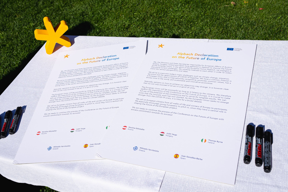 Im Rahmen des Europaforums in Alpbach unterzeichneten die anwesenden EU-Minister und -Ministerinnen beziehungsweise -Staatssekretäre die "Alpbach-Deklaration" zur Zukunft Europas. Bundesministerin Karoline Edtstadler sieht darin "ein klares Bekenntnis zum Dialog und zu einer breiten Teilnahme an der EU-Zukunftskonferenz". Zentrale Herausforderungen wie der Klimawandel, die Migration, der Terrorismus und die Auswirkungen der Pandemie seien am effektivsten gemeinsam zu bewältigen. Gemäß der Deklaration habe man ein gemeinsames Interesse an einer international wettbewerbsfähigen Union, die gemeinsame Werte fördert, eine starke Stimme in der Welt hat sowie an nachhaltigen und innovativen Volkswirtschaften.