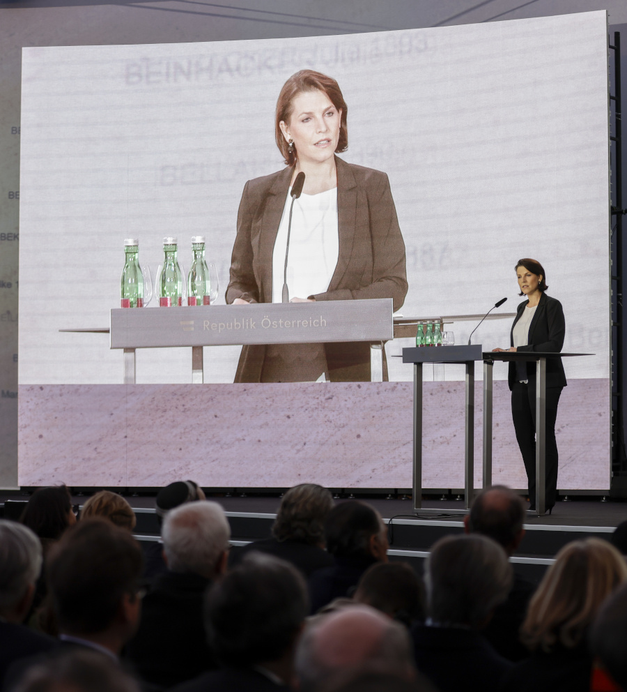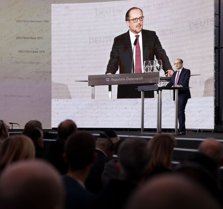 Zu dieser Verantwortung gehöre auch aktives Handeln in der Gegenwart und in der Zukunft. Wo immer es möglich sei, müsse alles darangesetzt werden, Opfern des Holocaust und ihren Familien die Hand zu reichen und um Versöhnung zu bitten. Zudem müsse alles getan werden, damit sich die Geschichte nicht wiederholt: "Nicht in Österreich, nicht in Europa, oder sonstwo auf der Welt." Jüdisches Leben müsse, wo immer notwendig, aktiv geschützt werden. Das beinhalte auch das klare Auftreten gegen jede Form von Hass und Antisemitismus. "Und eines ist klar: Nur wenn Jüdinnen und Juden auf der ganzen Welt in Sicherheit und Freiheit leben können, kann aus einem "niemals vergessen" ein "niemals wieder" werden", hielt Alexander Schallenberg fest.
