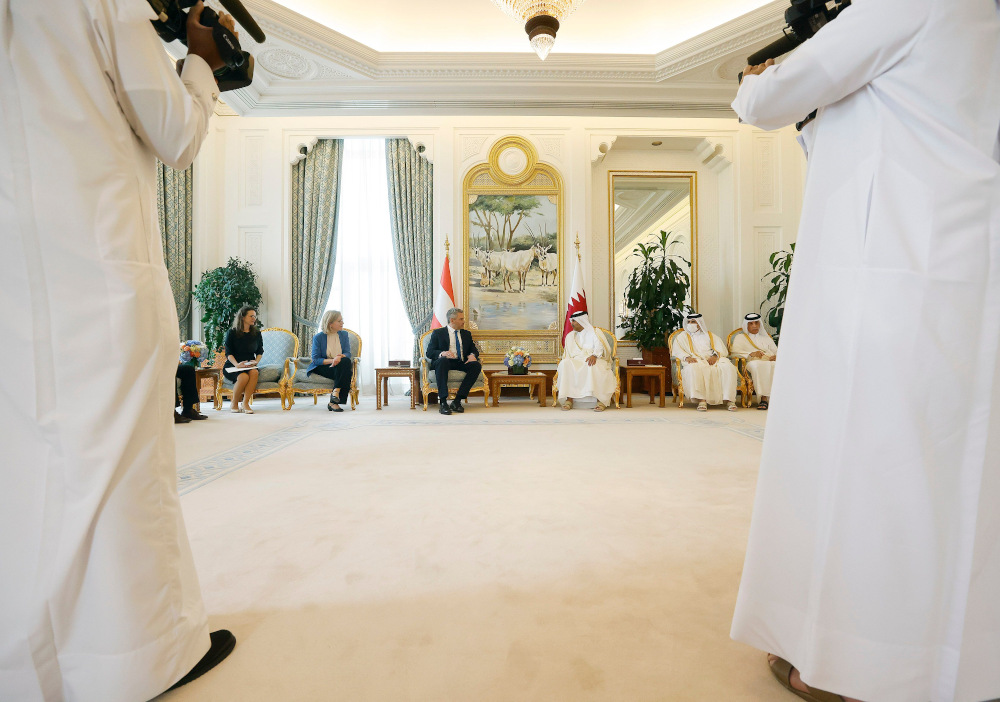 In Doha kam der Kanzler mit dem Emir von Katar, Tamim bin Hamad Al-Thani, und Premierminister Chalid bin Chalifa bin Abdulasis Al Thani zusammen. "Ich hatte einen guten Austausch mit Emir Tamim bin Hamad und Premierminister Chalid bin Chalifa Al Thani in Doha. Wir wollen unsere enge Kooperation weiter vertiefen", betonte Nehammer.