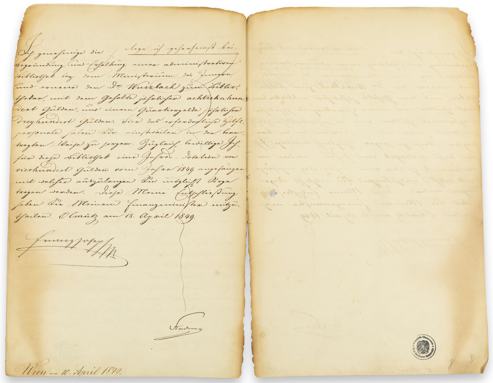 Ich genehmige die Begründung und Erhaltung einer administrativen Bibliothek bey dem Ministerium des Inneren, und ernenne den Dr. Wurzbach zum Bibliothekar, mit dem Gehalte jährlicher achtzehnhundert Gulden, und einem Quartiergelde jährlicher dreyhundert Gulden. Für das erforderliche Hilfspersonale haben Sie einstweilen in der beauftragten Weise zu sorgen. Zugleich bewillige ich für diese Bibliothek eine Jahres=Dotation von vierhundert Gulden vom Jahre 1849 angefangen, mit welcher Sie auszulangen Sie möglichst Sorge tragen werden. Diese Meine Entschließung haben Sie Meinem Finanzminister mitzutheilen. Olmütz am 18. April 1849
