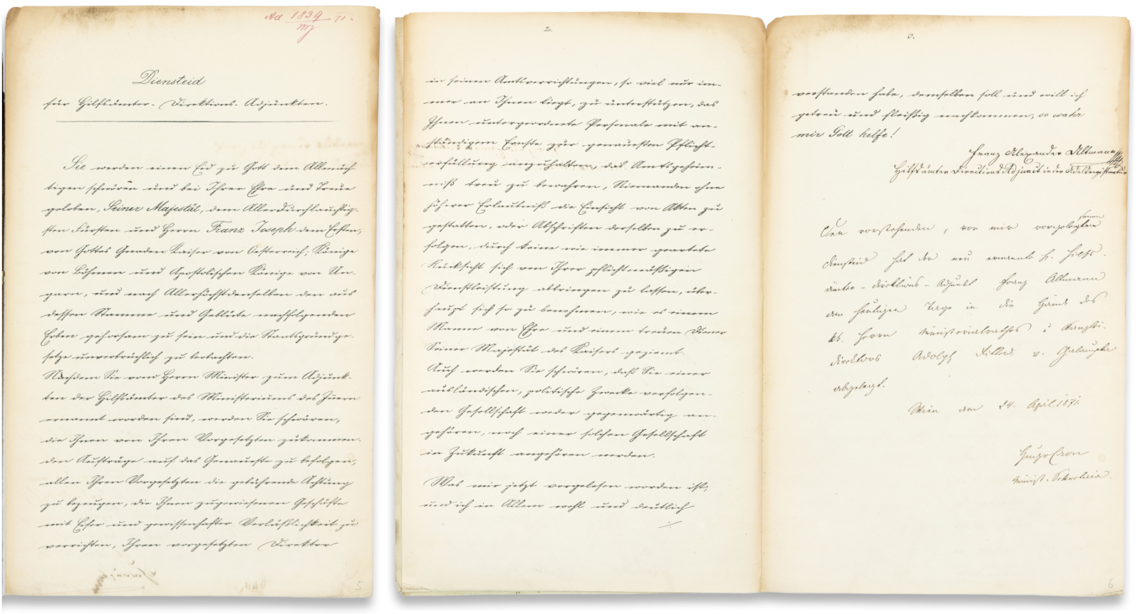 Nachdem Sie vom Herrn Minister zum Adjunkten der Hilfsämter des Ministeriums des Inneren ernannt worden sind, werden Sie schwören, die Ihnen von Ihren Vorgesetzten zukommenden Aufträgen auf das Genaueste zu befolgen, allen Ihren Vorgesetzten die gebührende Achtung zu bezeugen, die Ihnen zugewiesenen Geschäfte mit Eifer und gewissenhafter Verläßlichkeit zu verrichten, Ihren vorgesetzten Direktor in seinen Amtsverrichtungen, so viel nur immer an Ihnen liegt, zu unterstützen, das Ihnen untergeordnete Personale mit anständigen Ernste zur genauesten Pflichterfüllung anzuhalten, das Amtsgeheimniß treu zu bewahren, Niemanden ohne höherer Erlaubniß die Einscht von Akten zu gestatten, oder Abschriften derselben zu erfolgen, durch keine wie immer geartete Rücksicht sich von Ihrer pflichtmäßigen Dienstleistung abbringen zu lassen, überhaupt sich so zu benehmen, wie es einem Manne von Ehre und einem treuen Diener Seiner Majestät des Kaisers geziemt.
