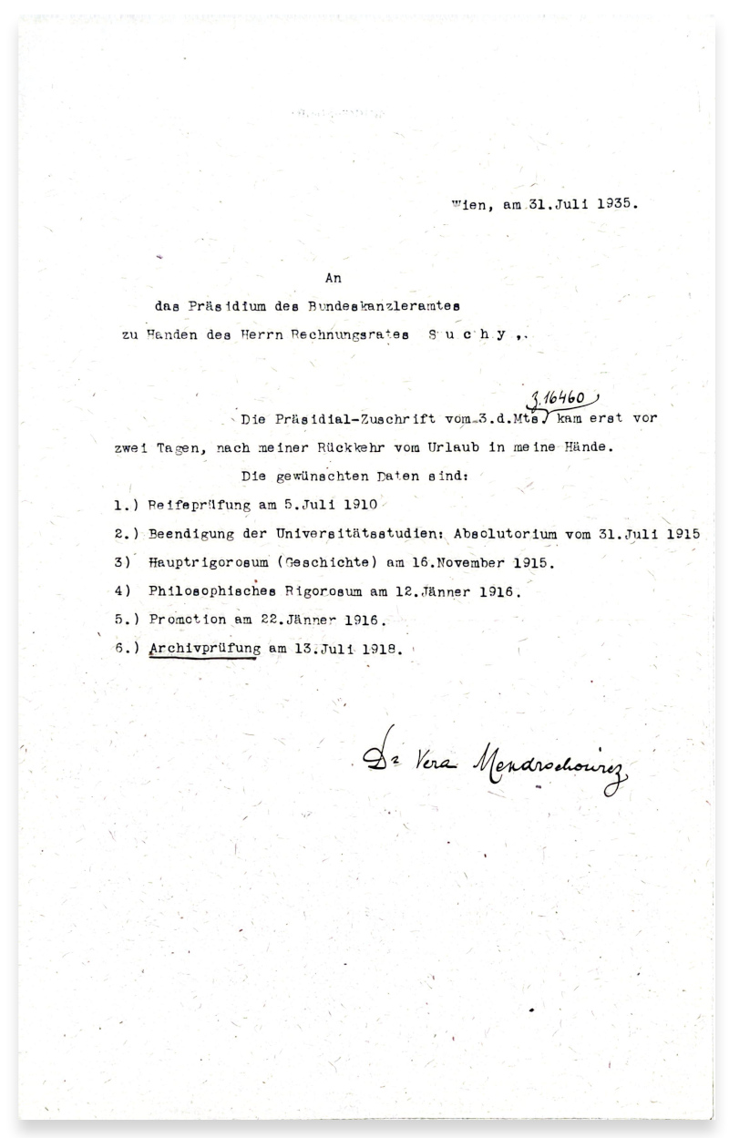 Im März 1938 wird das Dienstverhältnis mit Dr. Severa Mendrochowicz aufgrund ihrer jüdischen Abstammung aufgelöst. 1942 wird sie in einem Waldstück tot aufgefunden.
