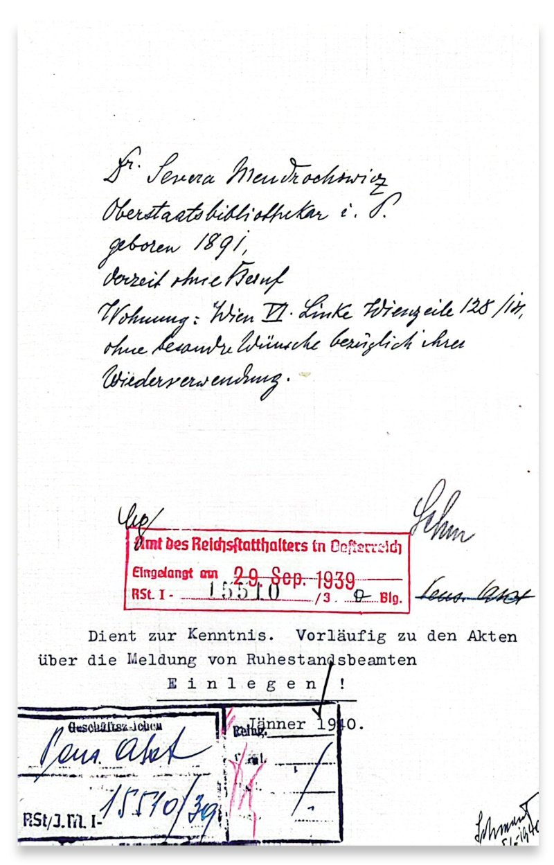 The library's former Deputy Director, Severa Mendrochowicz, was forced into retirement on October 31, 1938, under § 3 of the same ordinance, due to her Jewish heritage.