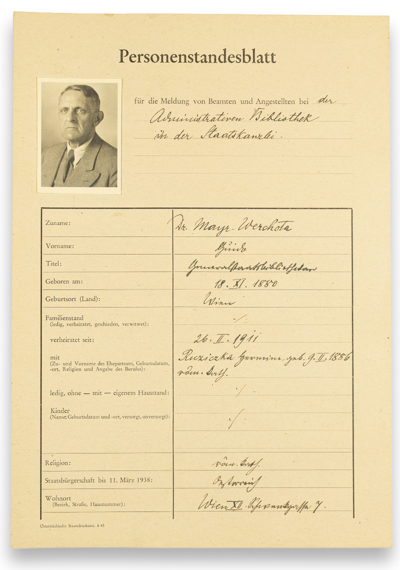 Guido Mayr-Werchota, Head of the Administrative Library since 1925, was forced into retirement in 1938 under § 6 of the Professional Civil Servants Ordinance.