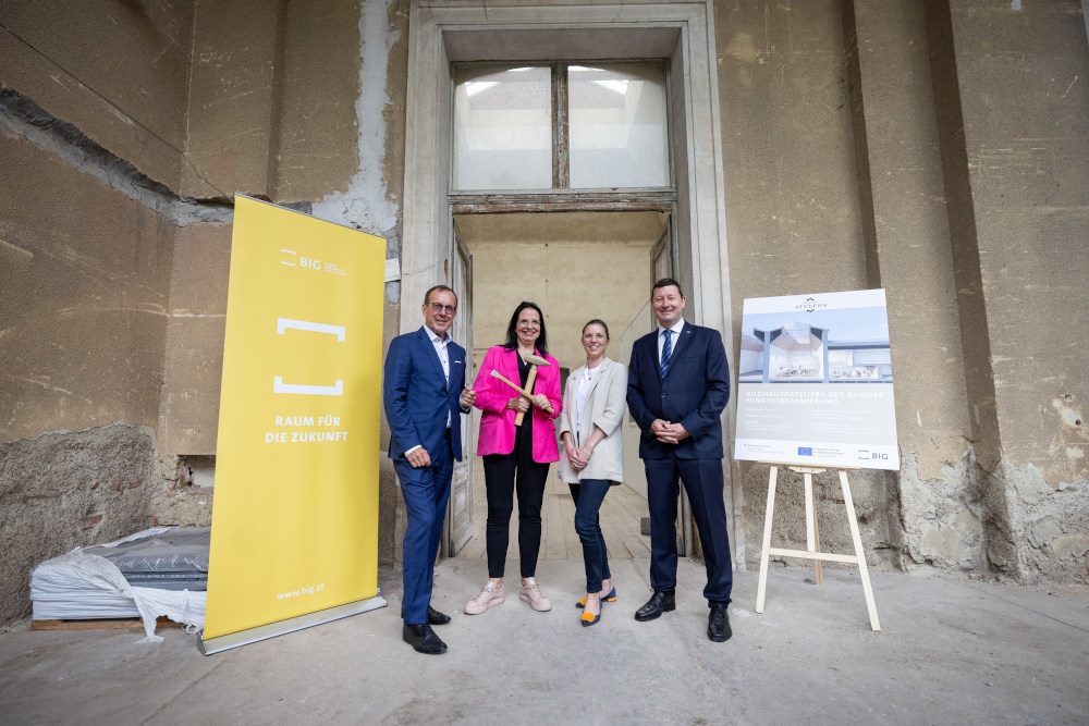 Anlässlich des Baustarts der Sanierungsarbeiten an den Praterateliers in Wien hat Kunst- und Kulturstaatssekretärin Andrea Mayer am 27. Juni 2023 gemeinsam mit dem Geschäftsführer der Bundesimmobiliengesellschaft (BIG), Wolfgang Gleissner, sowie dem Leiter der Vertretung der Europäischen Kommission in Österreich, Martin Selmayr, die Baustelle der Praterateliers besucht. Die beiden Pavillons der Praterateliers sollen sowohl thermisch als auch funktional im Sinne des Denkmalschutzes zeitgemäß saniert werden. Ziel der Sanierung ist es gelebte Baukultur mit umweltbewusstem Denkmalschutz zu verbinden. Die Ateliergebäude sollen als Arbeitsräumlichkeiten für bildende Künstlerinnen und Künstler erhalten bleiben und durch einen vielseitig einsetzbaren Multifunktionsraum sowie Projektateliers ergänzt werden. Die Gesamtkosten des Sanierungsvorhabens belaufen sich auf rund 15 Millionen Euro, wovon etwa zwei Drittel aus Mitteln des österreichischen EU-Aufbauplans kofinanziert werden. Die Fertigstellung der Sanierungsarbeiten an den Praterateliers ist für Anfang 2025 geplant.