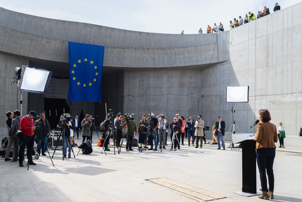 Im Rahmen des Besuchs der Baustelle der Koralmbahn-Zulaufstrecke am 24. März 2023 betonte Europaministerin Karoline Edtstadler: "Wir bauen auf Europa, dies trifft auf eines der beeindruckendsten Infrastrukturprojekte Europas zu. Der Flughafenast der Koralmbahn wird künftig die Fahrtzeit zwischen Graz und Klagenfurt mit der schnellsten Verbindung auf 45 Minuten verkürzen." Damit sei Österreich laut Karoline Edtstadler in einer Art "Poleposition", wenn es darum gehe Gelder abzuholen und dem Zweck entsprechend einzusetzen. "Österreich bekommt einen Betrag von 3,75 Milliarden Euro bis zum Jahr 2026. Aber wie alle anderen Mitgliedstaaten bekommen wir das Geld nicht einfach so, wir müssen nachweisen, dass wir das Geld leistungsgebunden einsetzen. Und dabei sind wir gut unterwegs!"