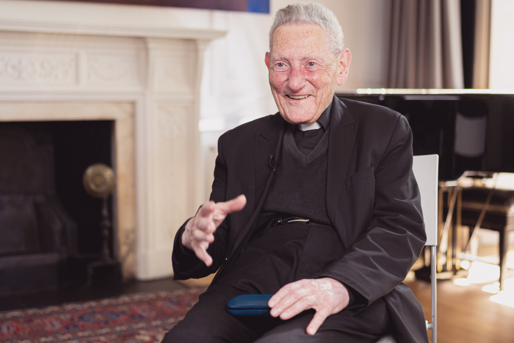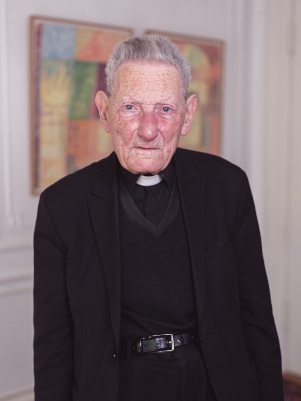 Mein Geburtsname ist Franz, nach dem Bruder meiner Mutter. Ich bin römisch-katholischer Priester im Ruhestand und 93 Jahre alt. Ich erinnere mich nur an einzelne Dinge vor dem Kindertransport. Einmal waren wir die Gastgeber einer Kinderjause. Ich hatte damals ein hölzernes Pferd. Eines der Mädchen, das bei uns zu Gast war, war sehr wild und ich hatte Angst um mein Spielzeug. Mein Vater sagte: "Lass sie machen! Wenn sie es ruiniert, lass sie es ruinieren." Ich erinnere mich auch an den Flieder im Park vor der Wohnung in der Gonzagagasse, an den Donaukanal am Rudolfsplatz und an den Geruch. An Extrawurst erinnere ich mich. Aber an nichts Zusammenhängendes.