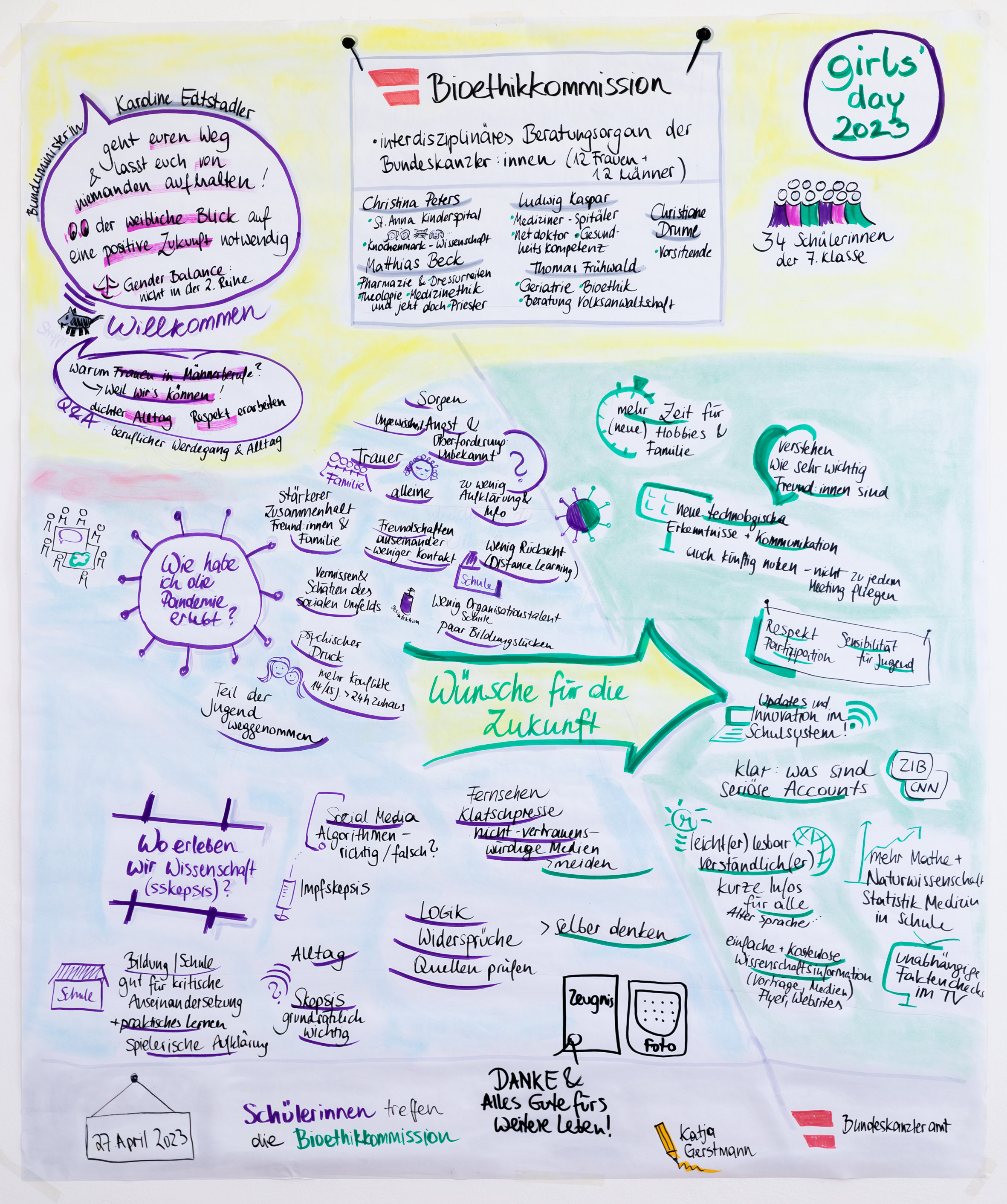 Die Bioethikkommission engagierte sich am 27. April 2023 erstmals beim Girls' Day im Bundesdienst. Schülerinnen der 11. Schulstufe hatten die Möglichkeit, Mitglieder der Bioethikkommission persönlich zu treffen und Einblicke in die spannende und vielfältige Arbeit der Bioethikkommission zu erhalten. Durch den direkten Austausch mit den hochrangigen Wissenschaftlerinnen und Wissenschaftlern sollte den Schülerinnen auch Interesse und Begeisterung für die Welt der Wissenschaft vermittelt werden. Bundesministerin Karoline Edtstadler begrüßte die Mädchen gemeinsam mit Christiane Druml, der Vorsitzenden der Bioethikkommission, und gab den Schülerinnen Einblicke in ihren beruflichen Werdegang.