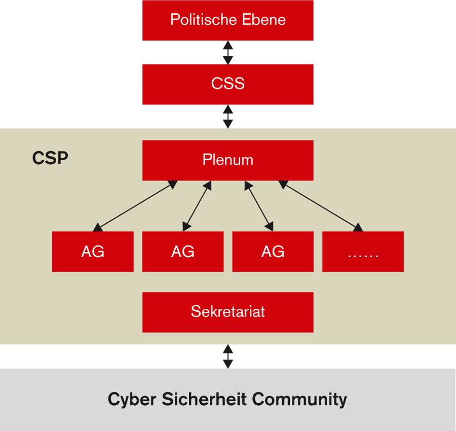 Darüber hinaus wirken auf strategischer Ebene die Cyber Sicherheit Steuerungsgruppe (CSS) und die Cyber Sicherheit Plattform (CSP). Die CSS ist für die Umsetzung der ÖSCS verantwortlich. Die CSP stellt die zentrale Austausch- und Kooperationsplattform zwischen Wirtschaft, Wissenschaft und öffentlicher Verwaltung dar.