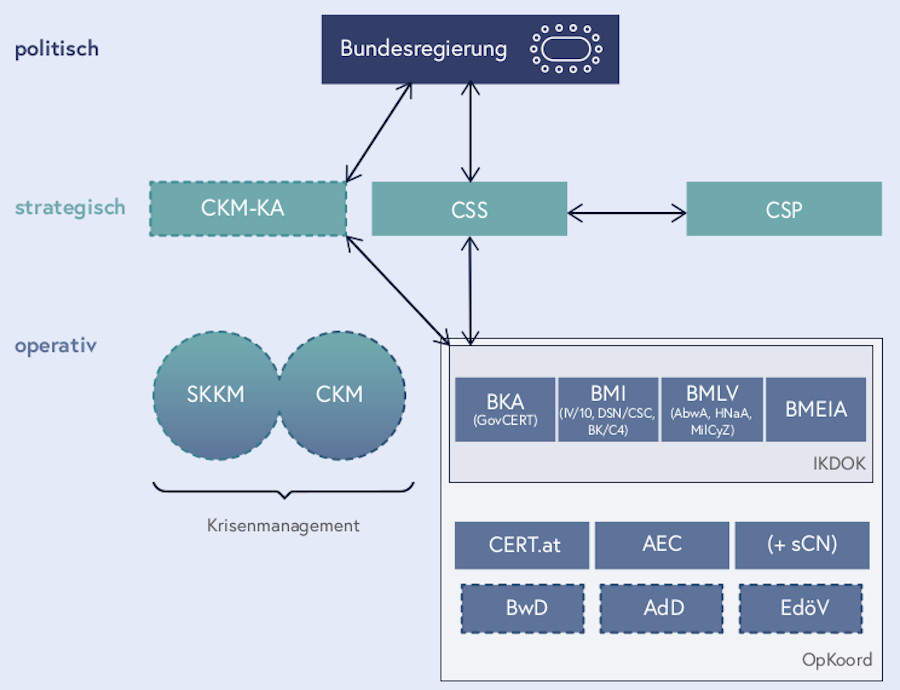 Cybersicherheit ist in Österreich ein gesamtstaatliches Thema. Es handelt sich auch rechtlich um eine Querschnittsangelegenheit. Folglich gibt es keine Stelle, die österreichweit verbindliche Vorgaben geben kann. Aus diesem Grund ist eine starke Koordinierung und Bündelung von Kräften notwendig. Hauptzuständig sind die folgenden Ministerien: Bundeskanzleramt (BKA), Bundesministerium für Inneres (BMI), Bundesministerium für europäische und internationale Angelegenheiten (BMEIA) und Bundesministerium für Landesverteidigung (BMLV).