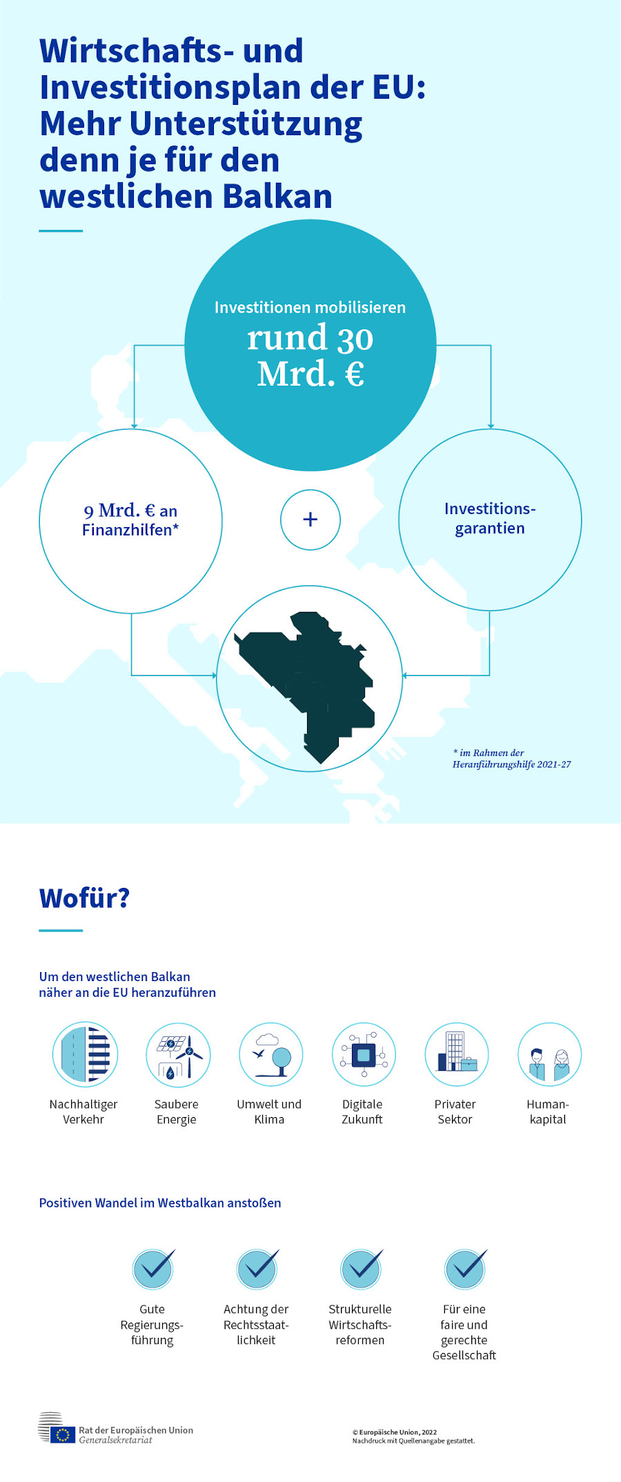 Das Gipfeltreffen am 6. Dezember 2022 bot Gelegenheit, über Fortschritte bei der Umsetzung des fast 30 Milliarden Euro an Gesamtvolumen fassenden Wirtschafts- und Investitionsplans zu beraten. Mit dem Plan soll die sozioökonomische Kluft zwischen dem Westbalkan und der EU überbrückt werden. Die Schwerpunkte liegen in den Bereichen ökologischer und digitaler Wandel, nachhaltiger Verkehr, saubere Energie, Unterstützung der Privatwirtschaft und Entwicklung des Humankapitals. Bis dato konnten bereits Finanzierungsbeschlüsse für 40 Vorzeigeprojekte erlassen werden, die einen Umfang von 1,8 Milliarden Euro an EU-Unterstützung und einen Investitionswert von insgesamt 5,7 Milliarden Euro haben.