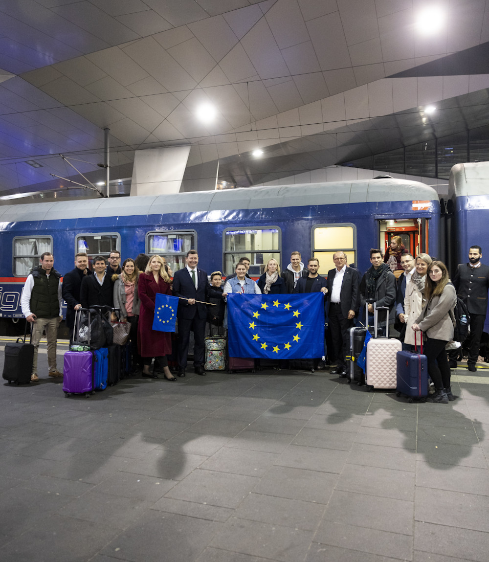 Die teilnehmenden Europa-Gemeinderätinnen und Europa-Gemeinderäte waren am 25. September 2022 klimafreundlich per Nachtzug nach Brüssel gereist – entsprechend einem der thematischen Schwerpunkte der Reise, nämlich Nachhaltigkeit. Am Wiener Hauptbahnhof hatten Martin Selmayr, Leiter der Vertretung der Europäischen Kommission in Österreich, sowie der Erste Vizepräsident des Europäischen Parlaments, Othmar Karas, die jungen Mandatarinnen und Mandatare verabschiedet. Selmayr betonte: "Bereits die Zugfahrt führt durch verschiedene Länder und unterstreicht so die europäische Dimension dieser Reise. So aktive Europa-Gemeinderätinnen und Europa-Gemeinderäte wie in Österreich gibt es sonst nirgendwo." Karas strich hervor: "Die Europa-Gemeinderätinnen und Europa-Gemeinderäte sowie Informationsreisen zählen zu den besten Initiativen, die es rund um die EU gibt. Vielen Dank für Eure Arbeit!"