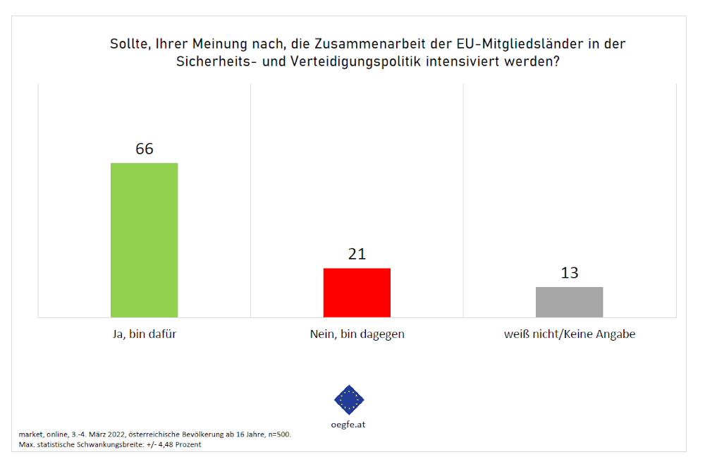 Vor dem Hintergrund des russischen Angriffskriegs auf die Ukraine treten 2 von 3 Österreicherinnen und Österreichern für mehr Kooperation in Fragen der Sicherheit und Verteidigung ein. Das ist eines der zentralen Ergebnisse, welche aus einer am 3. und 4. März 2022 online durchgeführten Umfrage der Österreichischen Gesellschaft für Europapolitik (ÖGfE) hervorgehen. Laut der am 12. März 2022 veröffentlichten Erhebung sprechen sich 66 Prozent für eine intensivere Zusammenarbeit der EU-Mitgliedstaaten in der Sicherheits- und Verteidigungspolitik aus. Etwa ein Fünftel (21 Prozent) ist gegen diesen Vorschlag; 13 Prozent äußern sich dazu nicht.