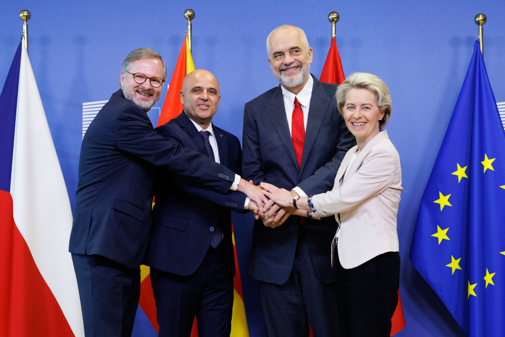 Vor diesem Hintergrund empfingen die Präsidentin der Europäischen Kommission, Ursula von der Leyen, und der tschechische Ministerpräsident, Petr Fiala (als Vertreter für den aktuellen tschechischen EU-Ratsvorsitz), den nordmazedonischen Ministerpräsidenten, Dimitar Kovačevski, und dessen albanischen Amtskollegen, Edi Rama, in Brüssel. Der Start der Beitrittsverhandlungen folgt auf den Beschluss des Rates vom 25. März 2020 über die Aufnahme von Beitrittsverhandlungen, der von den Mitgliedern des Europäischen Rates am 26. März 2020 gebilligt worden war, sowie die Billigung des Verhandlungsrahmens für die Verhandlungen mit Nordmazedonien und Albanien durch den Rat der EU am 18. Juli 2022, im Einklang mit der überarbeiteten Verfahrensweise bei der Erweiterung.