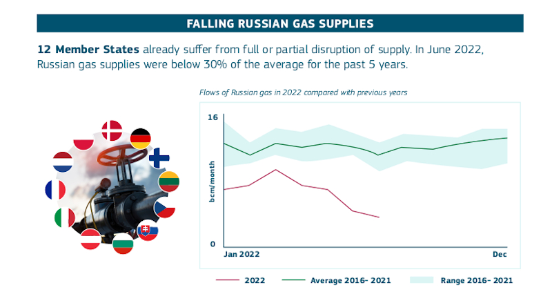 Am 9. August 2022 ist die Verordnung des Rates der EU über koordinierte Maßnahmen zur Senkung der Gasnachfrage in Kraft getreten. Die 27 EU-Mitgliedstaaten haben damit vereinbart, ihren Gasverbrauch zwischen 1. August 2022 und 31. März 2023 auf freiwilliger Basis ("nach besten Kräften") mit Maßnahmen ihrer Wahl um 15 Prozent gegenüber dem Durchschnittsverbrauch der vergangenen 5 Jahre (2016 bis 2021) zu senken. Die Reduktion um 15 Prozent entspricht einer EU-weiten Einsparung von etwa 45 Milliarden Kubikmetern an Gas. Ziel der Verordnung ist es, die Energieversorgungssicherheit in der EU zu erhöhen.