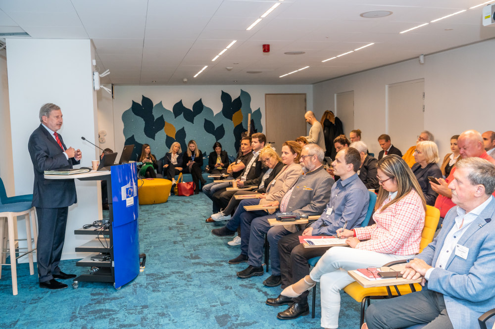 Für viele der teilnehmenden Europa-Gemeinderätinnen und -räte war das anschließende Treffen mit EU-Kommissar Johannes Hahn das Highlight der Brüssel-Reise. Bei seiner Rede hob Hahn, der in der Kommission für Verwaltung und Haushalt zuständig ist, vor allem die Bedeutung der Europawahlen 2024 hervor: "Mir ist vor allem wichtig zu kommunizieren und bei jeder Gelegenheit klarzumachen, wie entscheidend diese Europawahlen sind. Ich möchte Wahlen auf nationaler Ebene nicht kleinreden, sondern die Wahlen auf EU-Ebene 'großreden'", so Hahn, der auch auf die aktuellen Herausforderungen der EU, etwa die Asyl- und Sicherheitspolitik, die europäische Rüstungsindustrie sowie Zugänge zu neuen Märkten und Handelsverträgen, Bezug nahm. Nach einer Fragenrunde gab der EU-Kommissar den Europa-Gemeinderätinnen und -räten noch eine zentrale Botschaft mit auf den Weg: "Für mich ist die Europäische Union eine Versicherung auf Gegenseitigkeit. Unser Lebensstandard ist nur abgesichert durch europäische Zusammenarbeit und diese wird nicht abgesichert, indem man Grenzen und Zäune hochzieht. Dadurch nehmen wir uns Chancen. Die Erhaltung unseres Lebensstandards, die Erhaltung unserer Perspektiven in einer kompetitiven Welt, kann nur sichergestellt werden, indem wir zusammenstehen", betonte Kommissar Hahn.