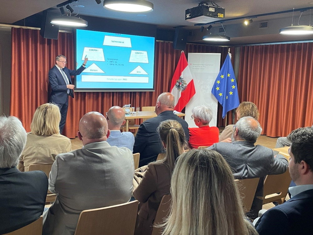 Gleich zu Beginn der mehrtägigen Bildungsreise stand ein Programm-Highlight: Nicole Bayer, Direktorin für Kommunikation beim Generalsekretariat des Rates der EU, begrüßte die Gruppe im Foyer des Justus-Lipsius-Gebäudes und sorgte für einen heimischen Empfang. Nach einer kurzen Einführung in die Tätigkeiten des Rates durch die Österreicherin führte der Weg in das Besucherinnen- und Besucherzentrum, wo Thomas Brandtner einen informativen Vortrag über das "magische Dreieck Europas", die 3 Institutionen der EU, hielt. Auch der Nachmittag des ersten Tages der Reise hielt eine Besonderheit bereit. Ein kurzer und vor allem regenreicher Spaziergang führte die Europa-Gemeinderätinnen und Europa-Gemeinderäteräte zur Ständigen Vertretung Österreichs bei der EU. Botschafter Franz Wirtenberger, Stellvertretender Ständiger Vertreter, gab gleich zu Beginn einen spannenden Einblick in die Arbeitsweisen, Aufgaben und Funktionen der Ständigen Vertretung, angereichert durch zahlreiche praxisnahe Beispiele.