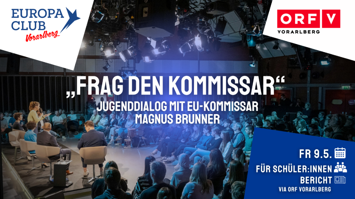 Was macht ein EU-Kommissar? Wie viele Flüchtlinge kann und soll Europa aufnehmen? Welche Chancen haben junge Menschen in Europa? Darüber und über viele weitere Themen wollen 200 Schülerinnen und Schüler aus ganz Vorarlberg bei der Jugenddiskussion "Frag den Kommissar" am 8. Mai 2025 im ORF-Landesfunkhaus Vorarlberg im Rahmen des Europa Club Vorarlberg reden. Die Jugendlichen richten ihre Fragen dabei direkt an EU-Kommissar Magnus Brunner. Moderatorin Christiane Schwald-Pösel vom ORF Vorarlberg begleitet diesen Dialog.