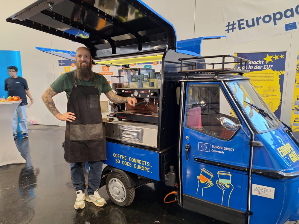 "Coffee connects. So does Europe." Österreich ist im Jahr 1995 der Europäischen Union beigetreten, beim diesjährigen Europatag steht Österreichs 30-jährige Mitgliedschaft in der EU im Fokus. Diesen Anlass möchte die Europainformation des Landes Tirol EUROPE DIRECT Tirol nutzen, um mit dem europacafé in Form eines umgebauten Kleintransporters mit integrierter Kaffeemaschine aktuelle Fragen und Anliegen rund um die Europäische Union zu diskutieren. Die Veranstaltung findet bei jedem Wetter statt.