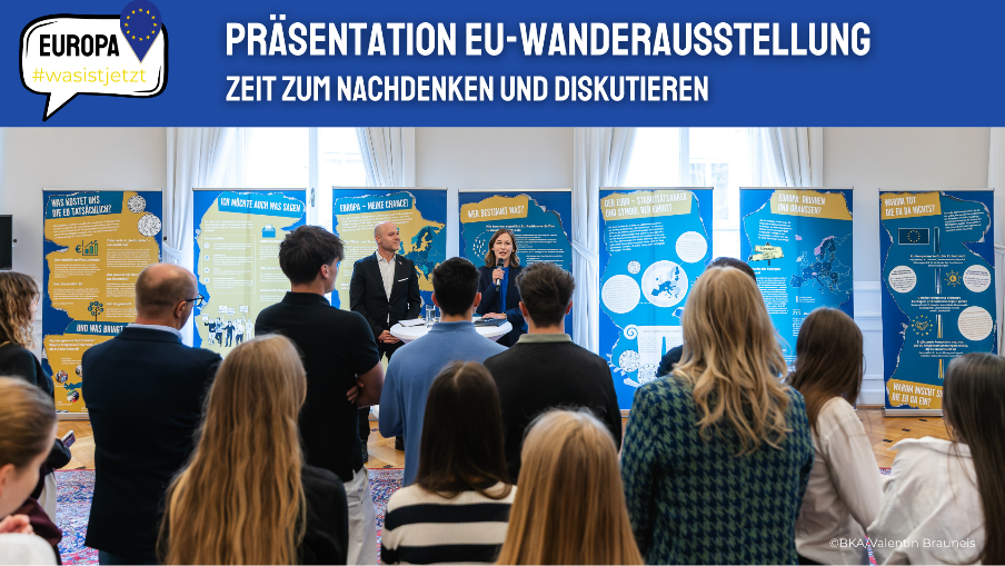 Am 5. Mai wurde im Bundeskanzleramt „EUROPA #wasistjetzt“, die frisch aktualisierte Wanderausstellung der Österreichischen Gesellschaft für Europapolitik (ÖGfE), vor über 100 Schülerinnen und Schülern der EU-Botschafterschule BG/BRG Neunkirchen präsentiert. Claudia Plakolm, Bundesministerin für Europa, Integration und Familie und ÖGfE-Generalsekretär Paul Schmidt standen den interessierten Jugendlichen in einer spannenden EU-Diskussion Rede und Antwort. Anlässlich des Jubiläums 30 Jahre EU-Mitgliedschaft Österreichs und angesichts neuer Herausforderungen wurde die Ausstellung „EUROPA #wasistjetzt“ über die letzten Monate inhaltlich überarbeitet und grafisch neu aufbereitet. Zielgruppe der Ausstellung sind Schulen aller Schulformen in ganz Österreich; die Inhalte sind insbesondere für Schülerinnen und Schüler der Oberstufe zwischen 15 und 19 Jahren konzipiert. Aktuell ist die Ausstellung in 2 Sets auf Tour und bereits bis zum Sommer ausgebucht. Termine werden jedoch laufend aktualisiert.